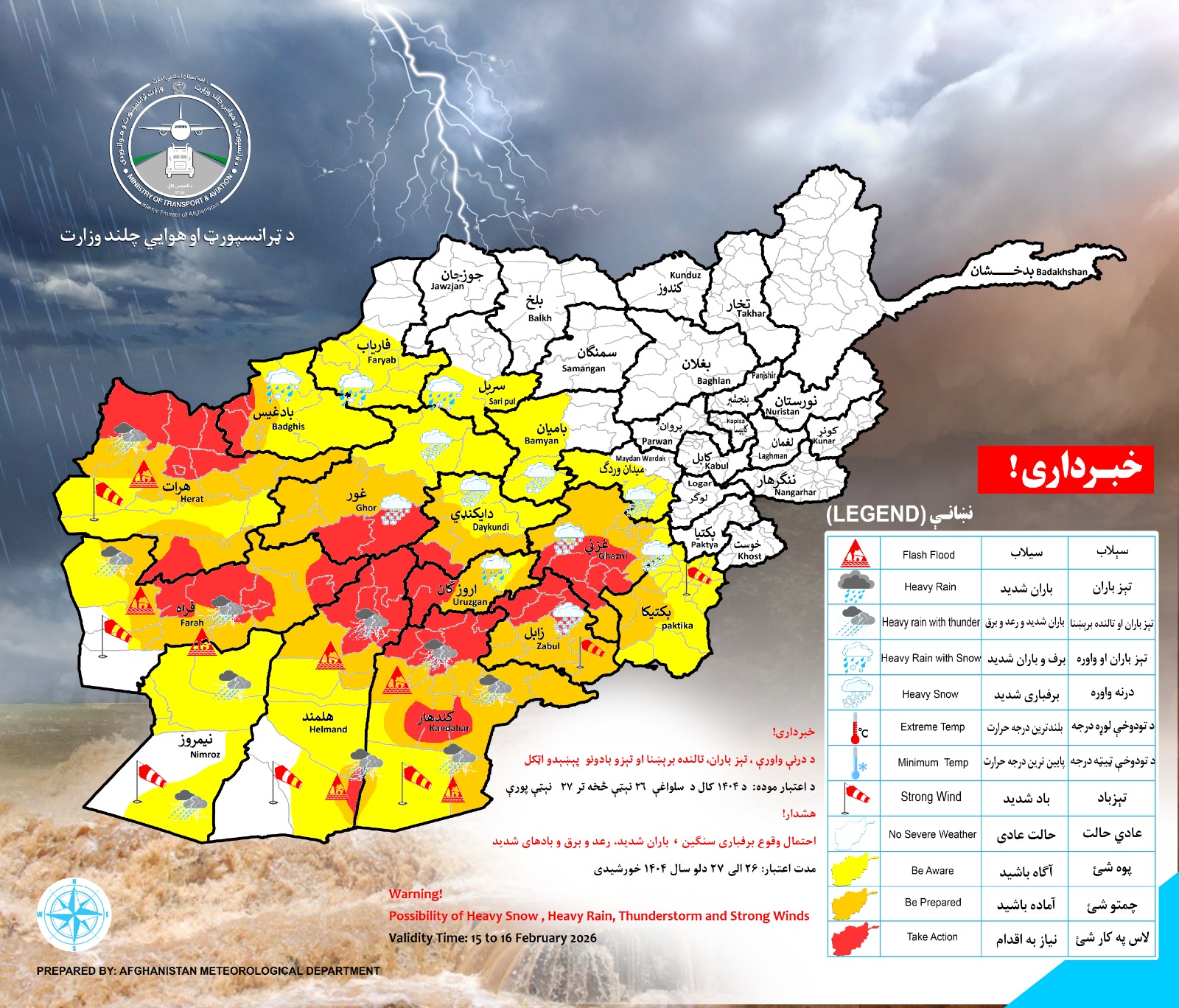 در ولایت های هرات فراه نیمروز هلمند کندهار ،زابل، پکتیکا ،غزنی ،اروزگان، دایکندی ،غور، بادغیس، فاریاب، سرپل، بامیان و میدان وردگ که مقدار باران در نقاط مختلف بین (۱۰) الی (۴۵ ملی متر و مقدار برف (۱۰) الی (۴۵) سانتی متر پیش بینی میگردد.