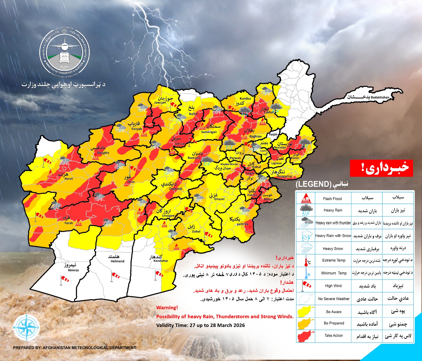 احتمال وقوع باران شدید رعد و برق بادهای شدید و سیلابهای انی در ولایات ذیل پیش بینی میگردد