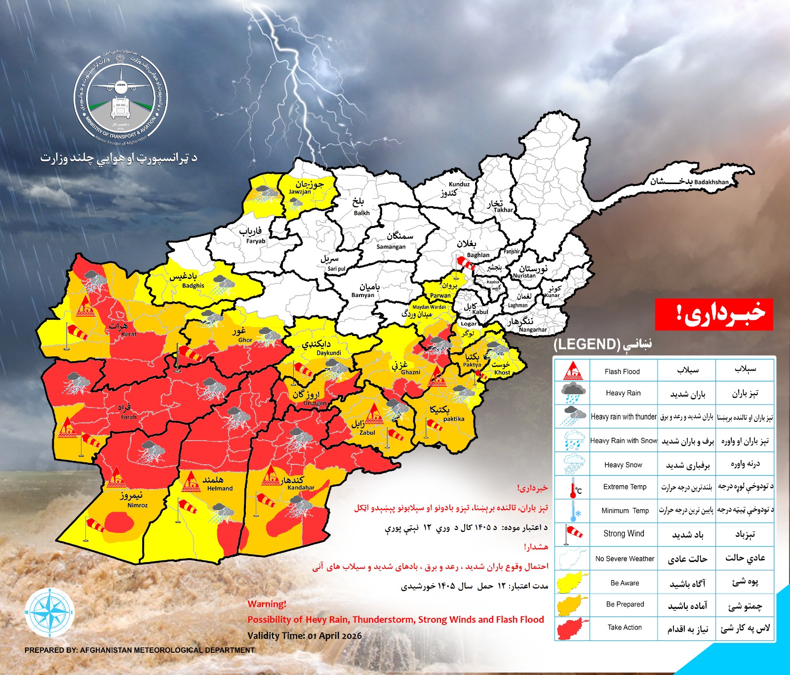 نوت: احتمال وقوع بارندگیهای شدید همراه با رعد و برق و سیلابهای آنی طی روزهای آینده از تاریخ ۱۲ الی ۱۵ حمل سال ۱۴۰۵ خورشیدی در اکثر ولایات کشور پیش بینی میشود بیشترین میزان بارندگیها در ولایتهای غربی جنوب غربی ،جنوبی جنوب شرقی شرقی و مرکزی منصور