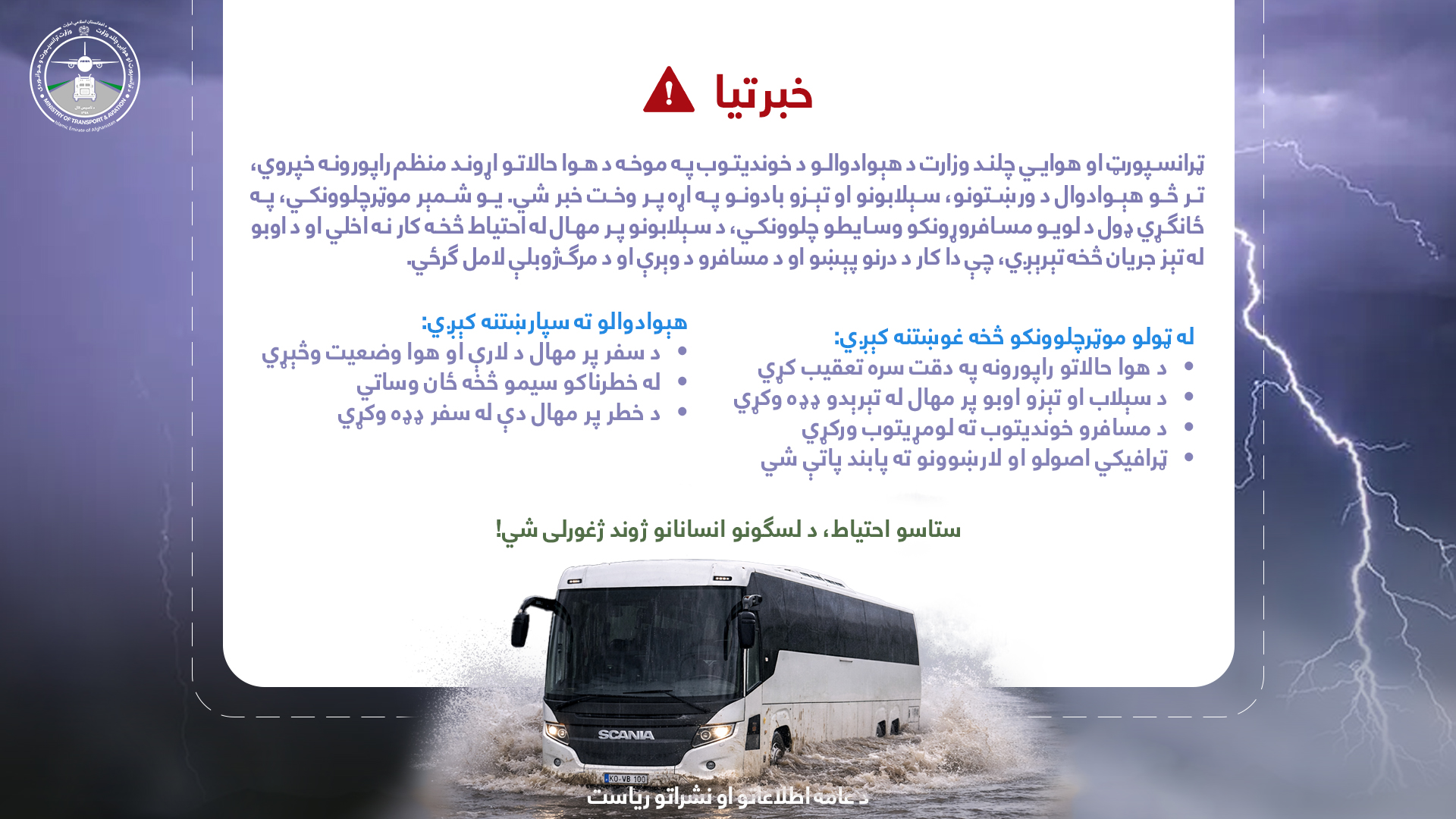 ټرانسپورټ او هوایي چلند وزارت د هېوادوالو د خوندیتوب په موخه د هوا حالاتو اړوند منظم راپورونه خپروي ترخو هېوادوال د ورښتونو، سېلابونو او تېزو بادونو په اړه پر وخت خبر شي. يو شمېر موټرچلوونکي، په ځانگړي ډول د لويو مسافرورونکو وسایطو چلوونکي، د سېلابونو پر مهال له احتیاط څخه کار نه اخلي او د اوبو له تيز جريان څخه تېرېږي، چې دا کار د درنو پېښو او د مسافرو د وېرې او د مرگ ژوبلې لامل گرځي.