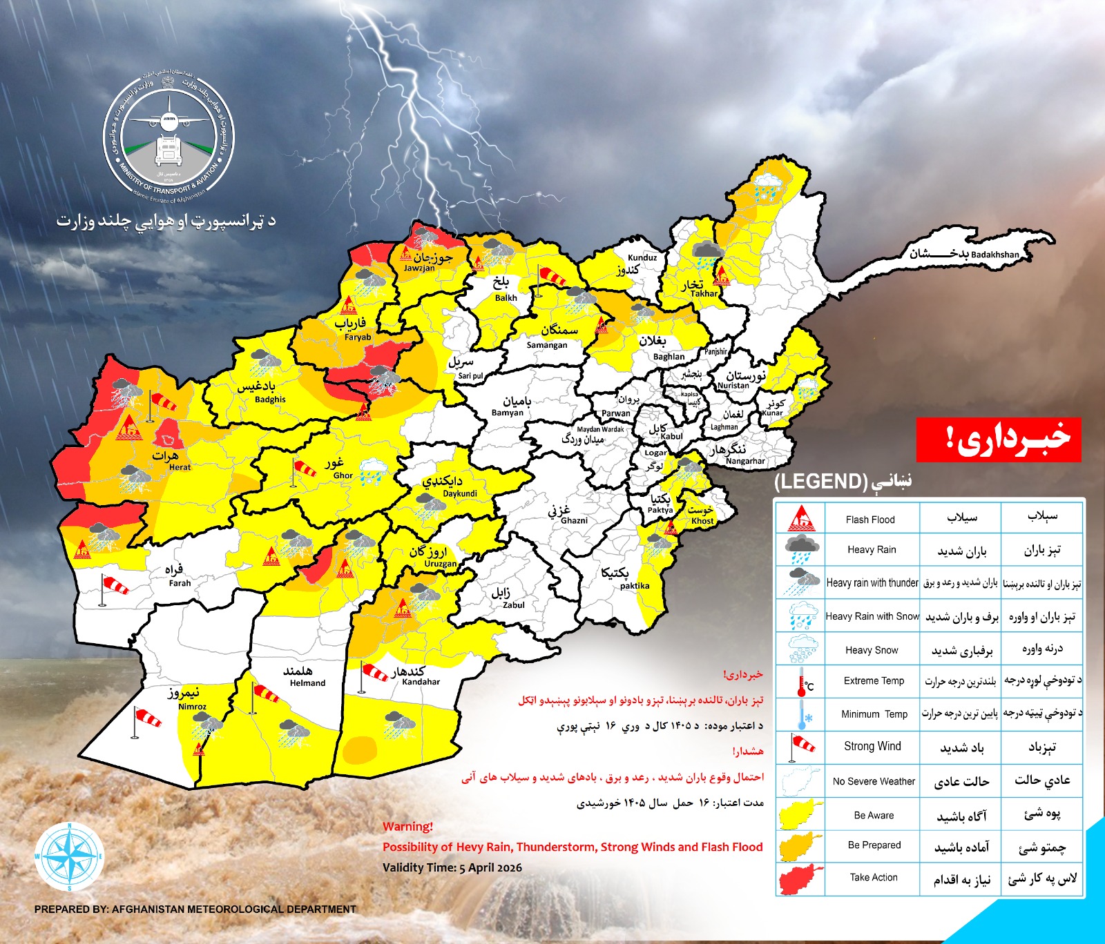 ۳. د یوې اونۍ په ترڅ کې د هوا د حالاتو په اړه ٦ بېلابېلې خبرتیاوی خپرې شوي او هیوادوالو ته د بارانونو سېلابونو او قوي بادونو په اړه د احتیاط سپارښتنه شوې ده.