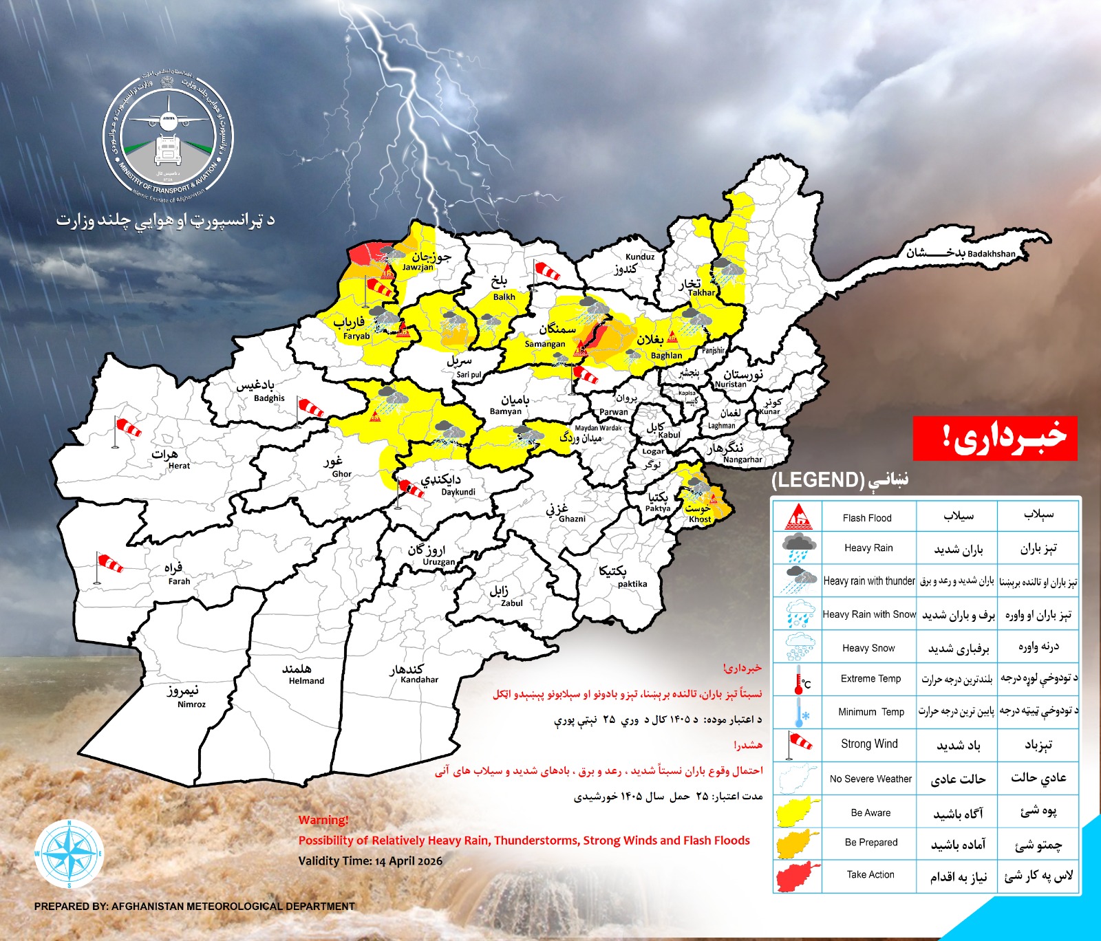 احتمال وقوع باران شدید رعد و برق یادهای شدید همراه با گرد و خاک و سیلابهای آنی در ولایات ذیل پیش بینی میگردد