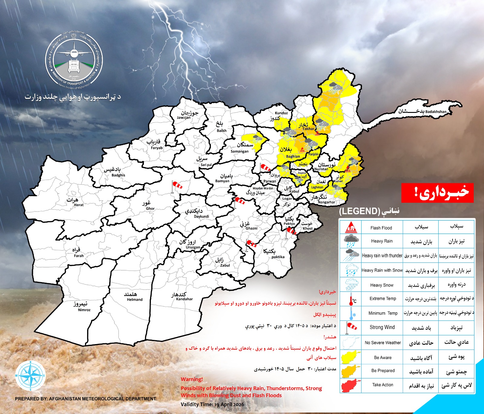 احتمال وقوع باران نسبتاً شدید رعد و برق بادهای شدید همراه با گرد و خاک و سیلابهای آنی در ولایات ذیل پیش بینی میگردد