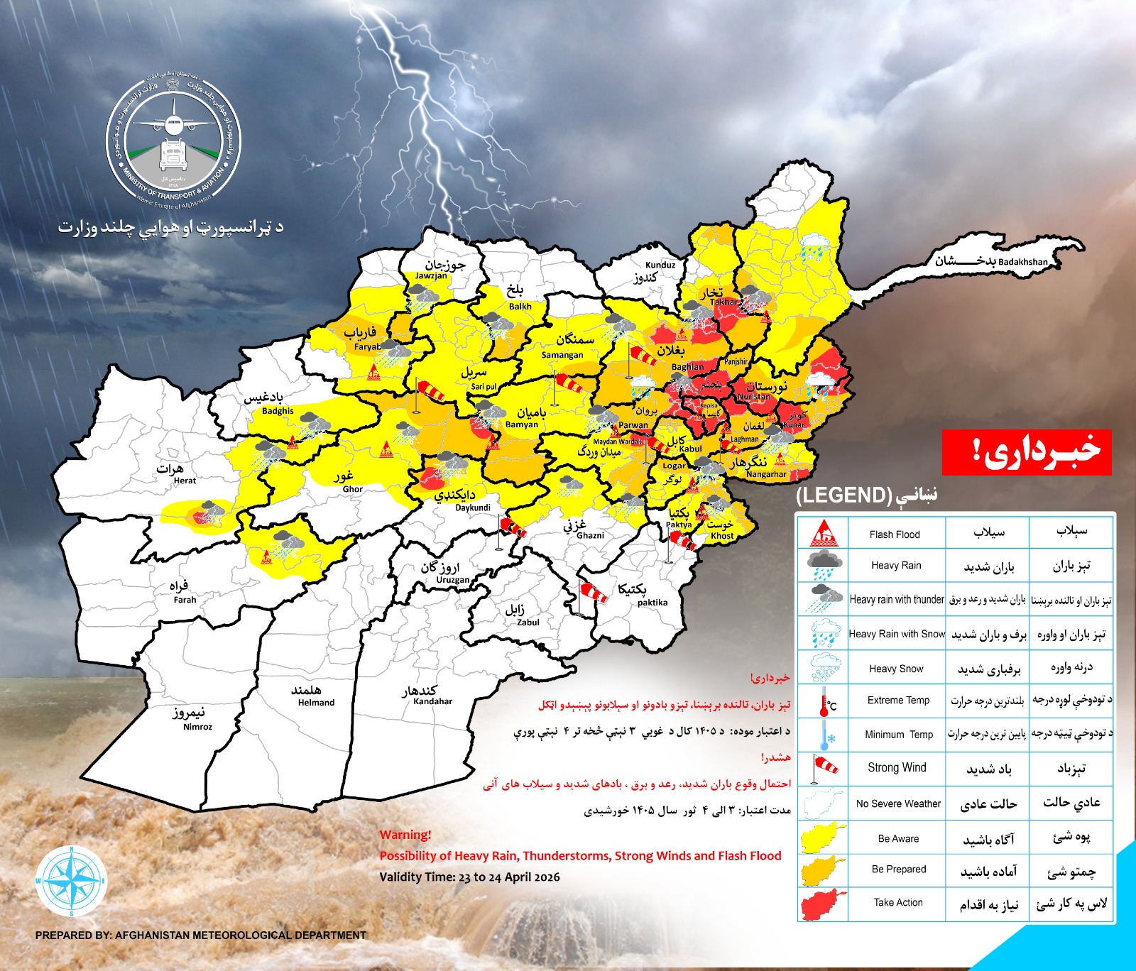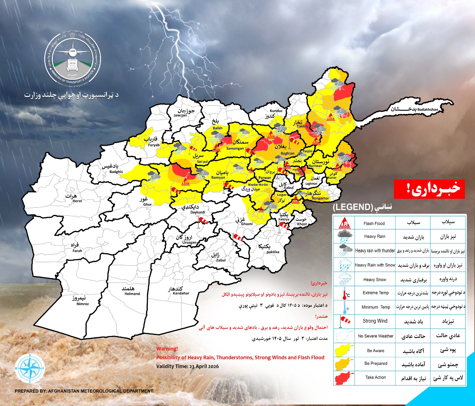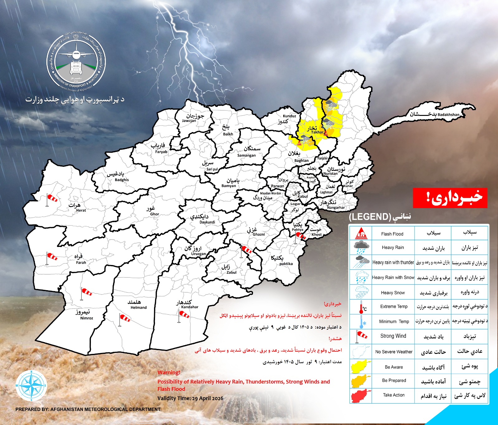 احتمال وقوع باران شدید رعد و برق بادهای شدید و سیلابهای آنی در ولایات ذیل پیش بینی میگردد