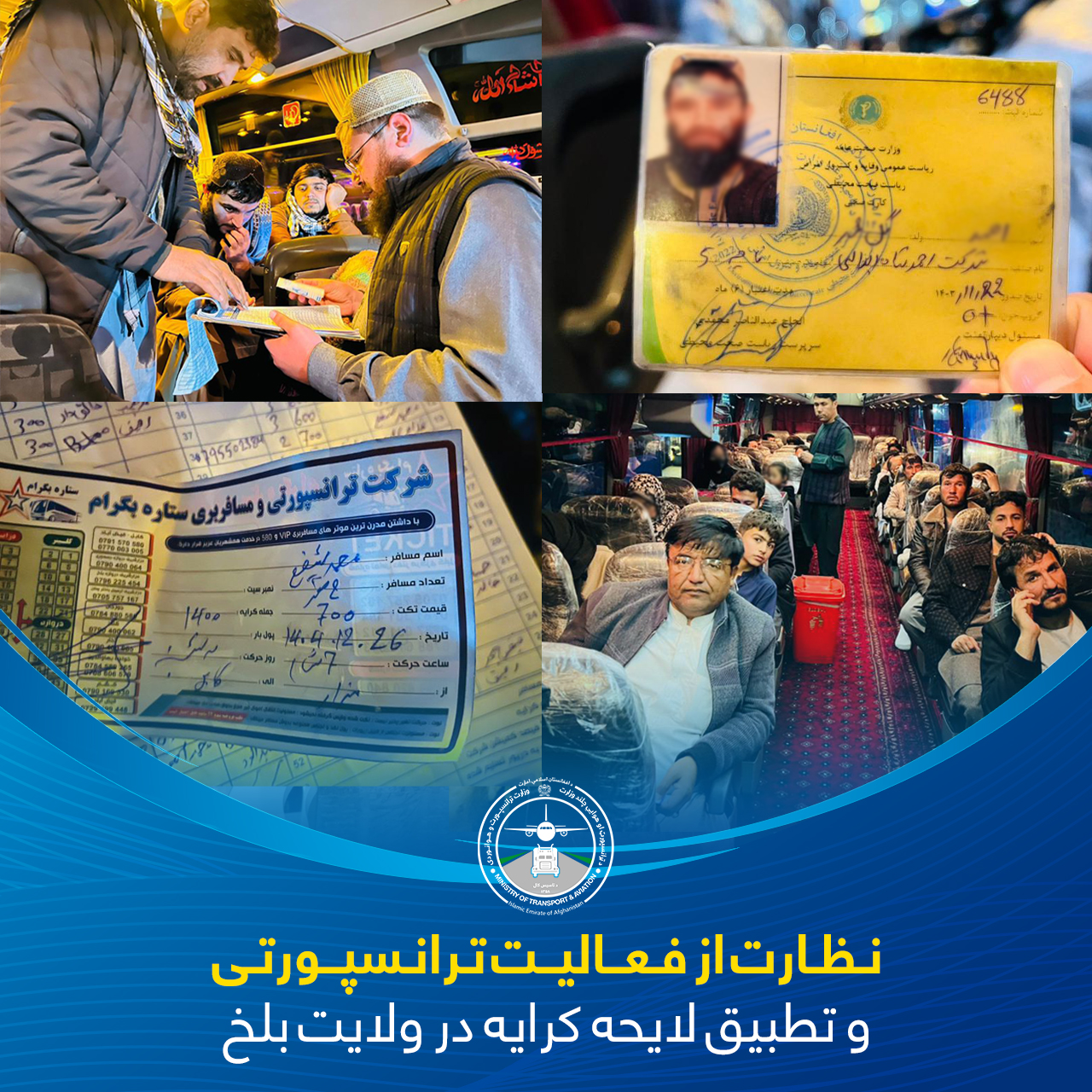 مسئولان ریاست تنظیم ترانسپورت جادهای ولایت بلخ بهمنظور تأمین نظم بهتر ترانسپورتی و ارائه خدمات معیاری به مسافران، از چگونگی تطبیق لایحه کرایه، بررسی اسناد ترانسپورتی و ترافیکی، کارت صحی رانندگان و منع انتقال بار در وسایط مسافربری نظارت نمودند. در جریان این نظارت، هدایت داده شد که رانندگان و شرکتهای ترانسپورتی در روزهای عید سعید فطر در قسمت انتقال مصؤن مسافران به مقاصد شان، همکاری جدی نموده و لایحه کرایه را نیز رعایت کنند.