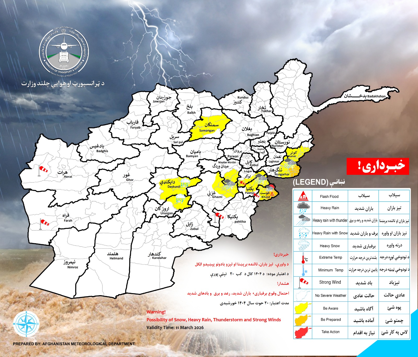 در ولایت های کنر، ننگرهار، لوگر ،پکتیا ،خوست میدان وردگ، غزنی ،اروزگان، دایکندی و سمنگان که مقدار باران در نقاط مختلف بین (۱۰) الى (۲۰) ملی متر و مقدار برف (۱۰ الی ۲۰) سانتی متر پیش بینی میگردد.