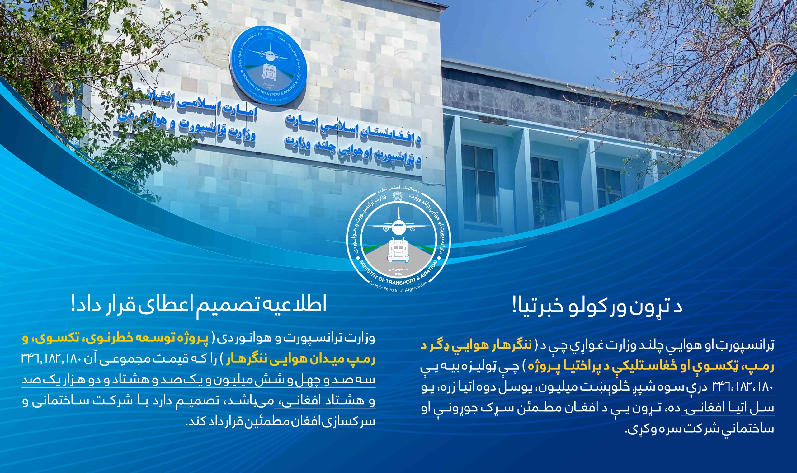وزارت ترانسپورت و هوانوردی ( پروژه ترمینل باربری مرکز ارزگان فاز اول) را که قیمت مجموعی آن ۵۲,۲۹۸,۴۶۴ پنجاه و دو میلیون و دو صد و نود و هشت هزار و چهار صد و شصت و چهار افغانی میباشد تصمیم دارد با آریانا حمید الله وزیری و دانیز شرکت قرار داد کند.