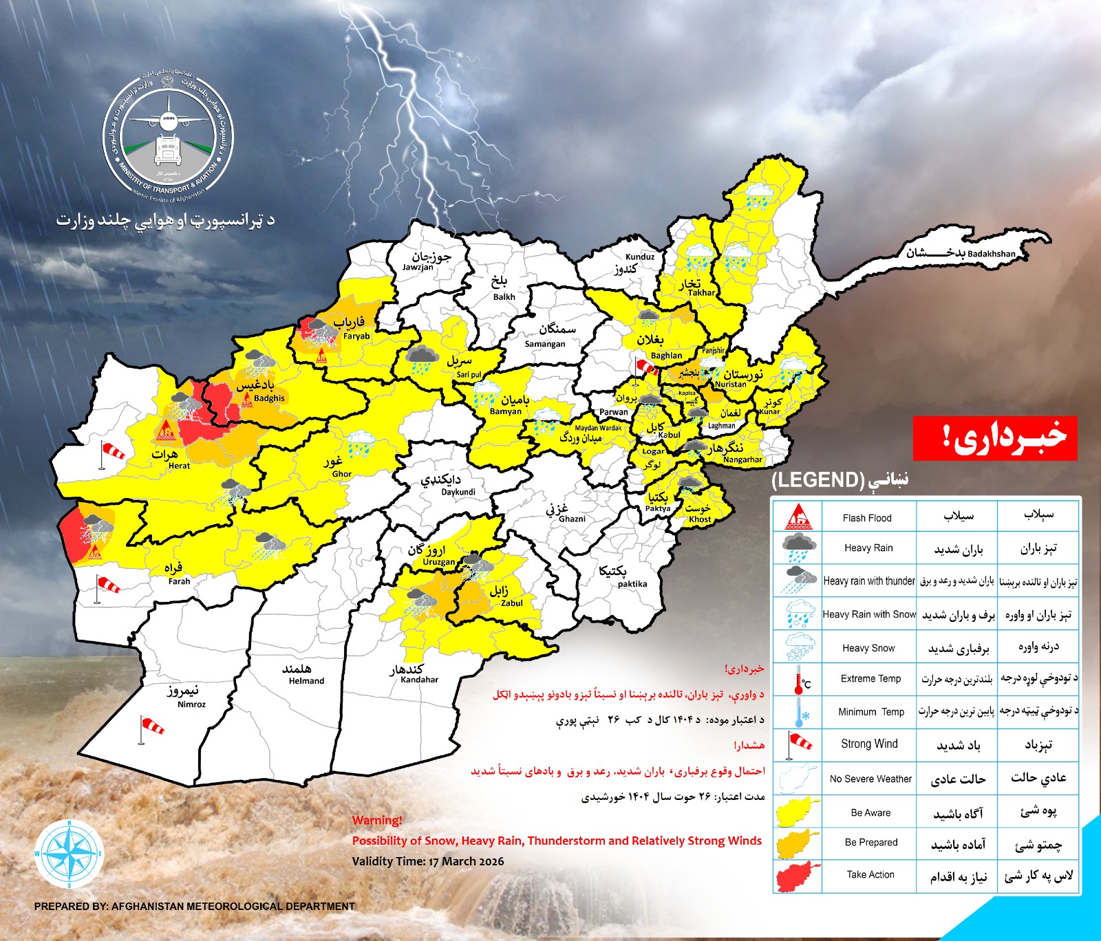 احتمال وقوع برفباری باران شدید رعد و برق و بادهای نسبتاً شدید در ولایات ذیل پیش بینی میگردد
