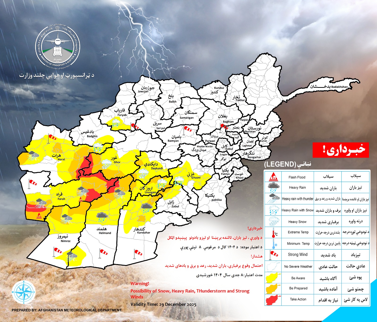 په غزنی دایکندی اروزگان ،غور فاریاب بادغیس هرات فراه نیمرزو هلمند کندهار او زابل ولايتونو کې چې د باران کچه په بېلابېل سيمو کې له ۱۰) څخه تر (۳۰) ملي متره او د واورې کچه له (۱۰) څخه تر (۳۵) سانتي مترو پورې اټکل کېږي.
