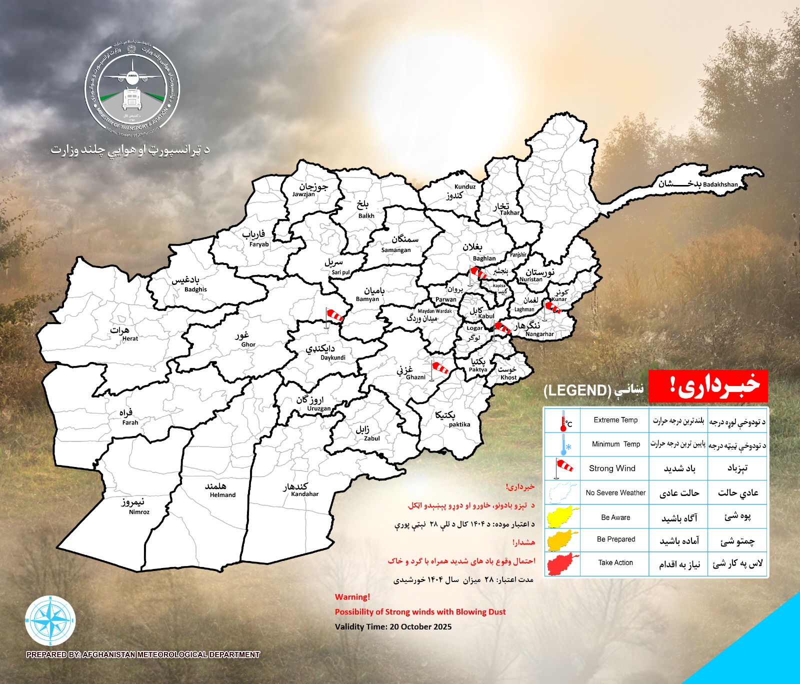 در ولایتهای بدخشان تخار ،نورستان ،ننگرهار کاپیسا پنجشیر و پروان که مقدار باران در نقاط مختلف بین (۱۰) الی (۲۵) ملی متر پیش بینی میگردد.