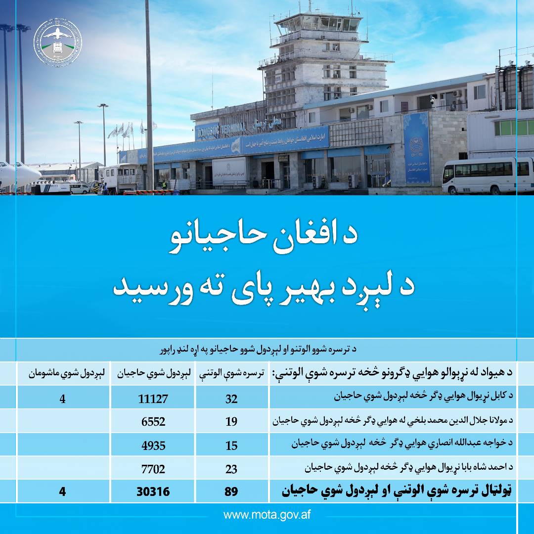 د افغان حاجيانو د لېږد بهير چې ۱۴۰۲/۲/۳۱ نېټه پيل شوی و، نن سهار د کابل هوايي ډګر څخه د وروستۍ نهه اتيايمې الوتنې سره پای ته ورسيد او ټولټال ۳۰۳۱۶ حاجيان سعودي عربستان ته ولېږدول شول.