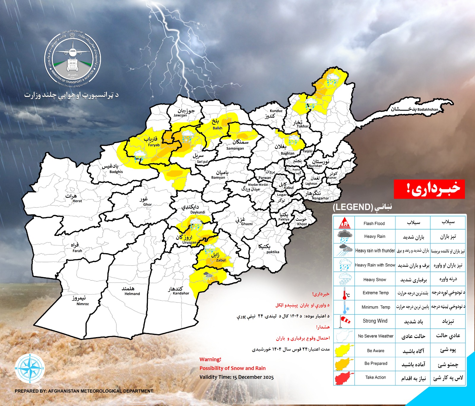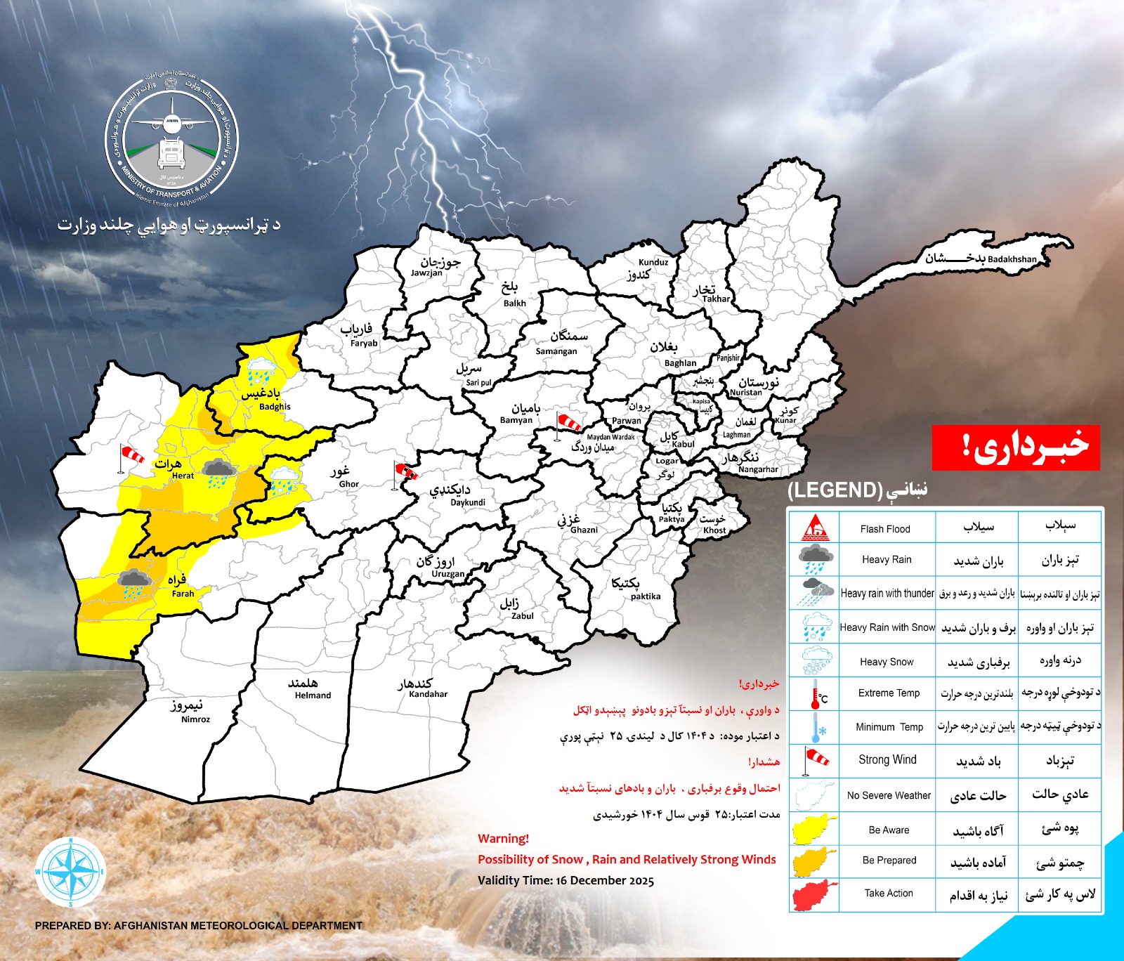په غور بادغیس، هرات او فراه ولایتونو کې چې د باران کچه په بېلابېلو سيمو کې له ۱۰) څخه تر (۲۰) ملي متره او د واورې کچه له (۱۰) څخه تر (۳۰ سانتي مترو پورې اټکل کېږي.