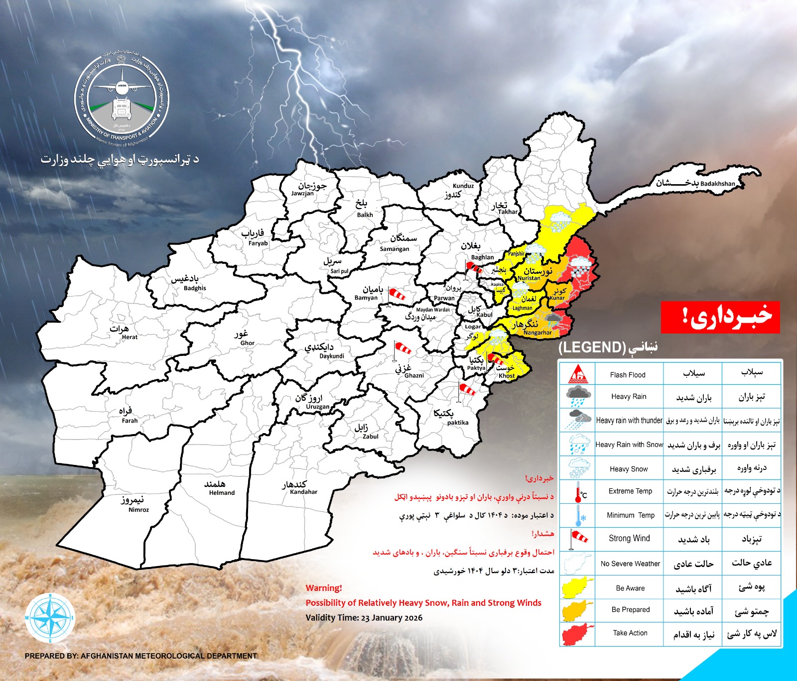 In the central and Southern Provinces including Salangs possibility of Strong Winds the amount of Wind speed will be between (50 to 95) Km/h in different area.