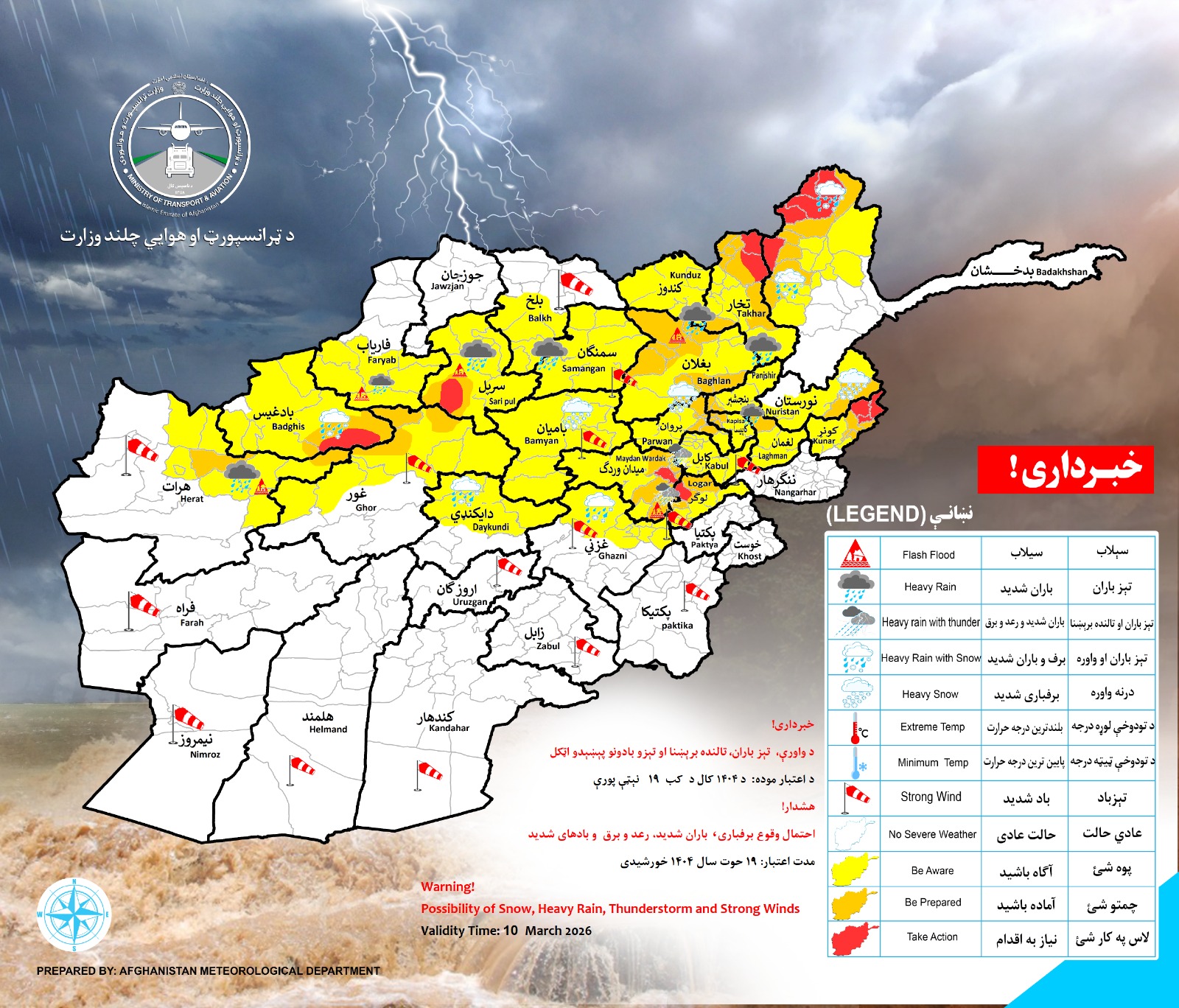 Herat, Badghis, Ghor, Faryab, Sari Pul, Balkh, Samangan, Baghlan, Kunduz, Takhar, Badakhshan, Nuristan, Kunar, Laghman, Kapisa, Panjshir, Parwan, Kabul, Logar, Maydan Wardak, Ghazni, Bamyan and Daykundi Provinces the amount of rainfall is between (10 to 30) mm and amount of snowfall (10 to 30) cm in different area.