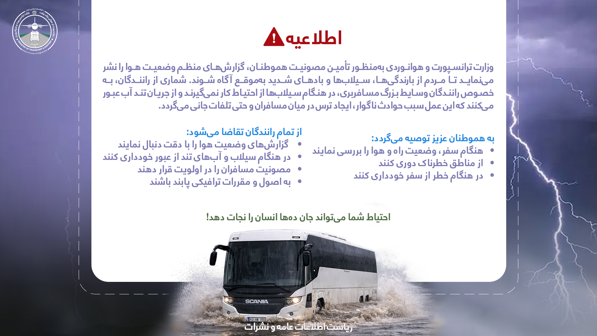 وزارت ترانسپورت و هوانوردی به منظور تأمين مصونیت هموطنان گزارشهای منظم وضعیت هوا را نشر مینماید تا مردم از بارندگی ها سیلابها و بادهای شدید به موقع آگاه شوند. شماری از رانندگان به خصوص رانندگان وسایط بزرگ مسافربری در هنگام سیلابها از احتیاط کار نمیگیرند و از جریان تند آب عبور میکنند که این عمل سبب حوادث ناگوار ، ایجاد ترس در میان مسافران و حتی تلفات جانی میگردد.
