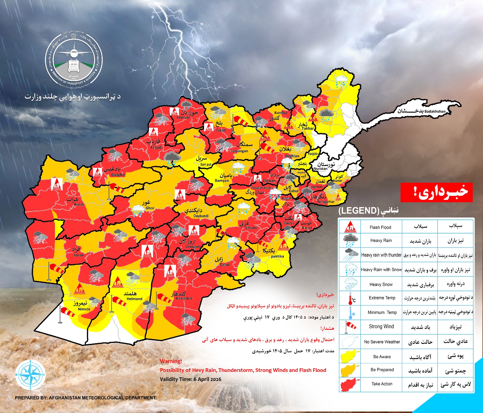 احتمال وقوع بارندگیهای شدید همراه با رعد و برق و سیلابهای آنی در اکثر ولایات کشور پیشبینی شده است. از تمام هموطنان عزیز خواهش میشود که در جریان بارندگیها از نزدیک شدن به دریاها و مناطقی که در معرض خطر سیلاب قرار دارند، دوری کنند. همچنان به رانندگان محترم توصیه میشود که در جریان بارندگیها از تردد در ساحات سیلابی جداً خودداری کنند.