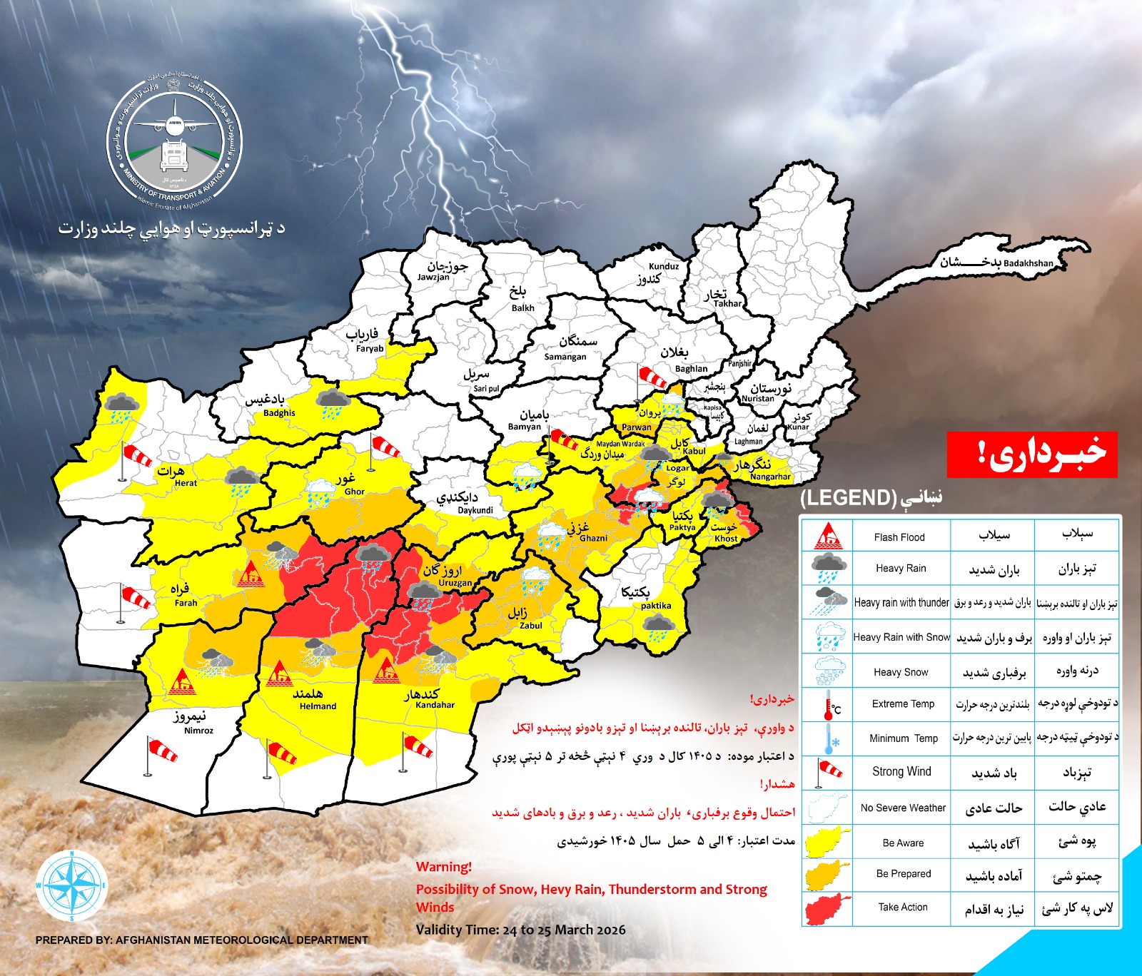 احتمال وقوع ،برفباری باران شدید رعد و برق و بادهای شدید در ولایات ذیل پیش بینی میگردد