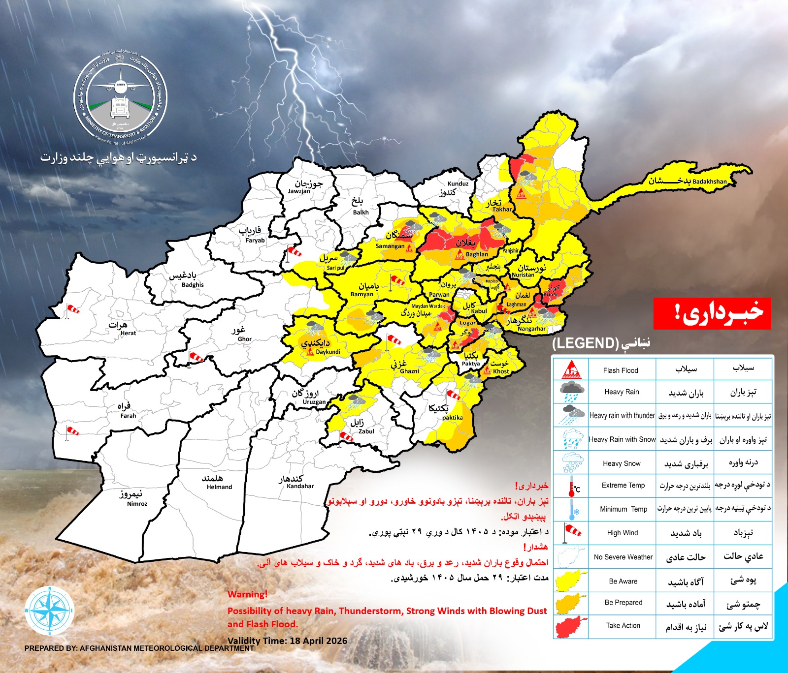 احتمال وقوع باران نسبتاً شدید رعد و برق بادهای شدید همراه با گرد و خاک و سیلابهای آنی در ولایات ذیل پیش بینی میگردد