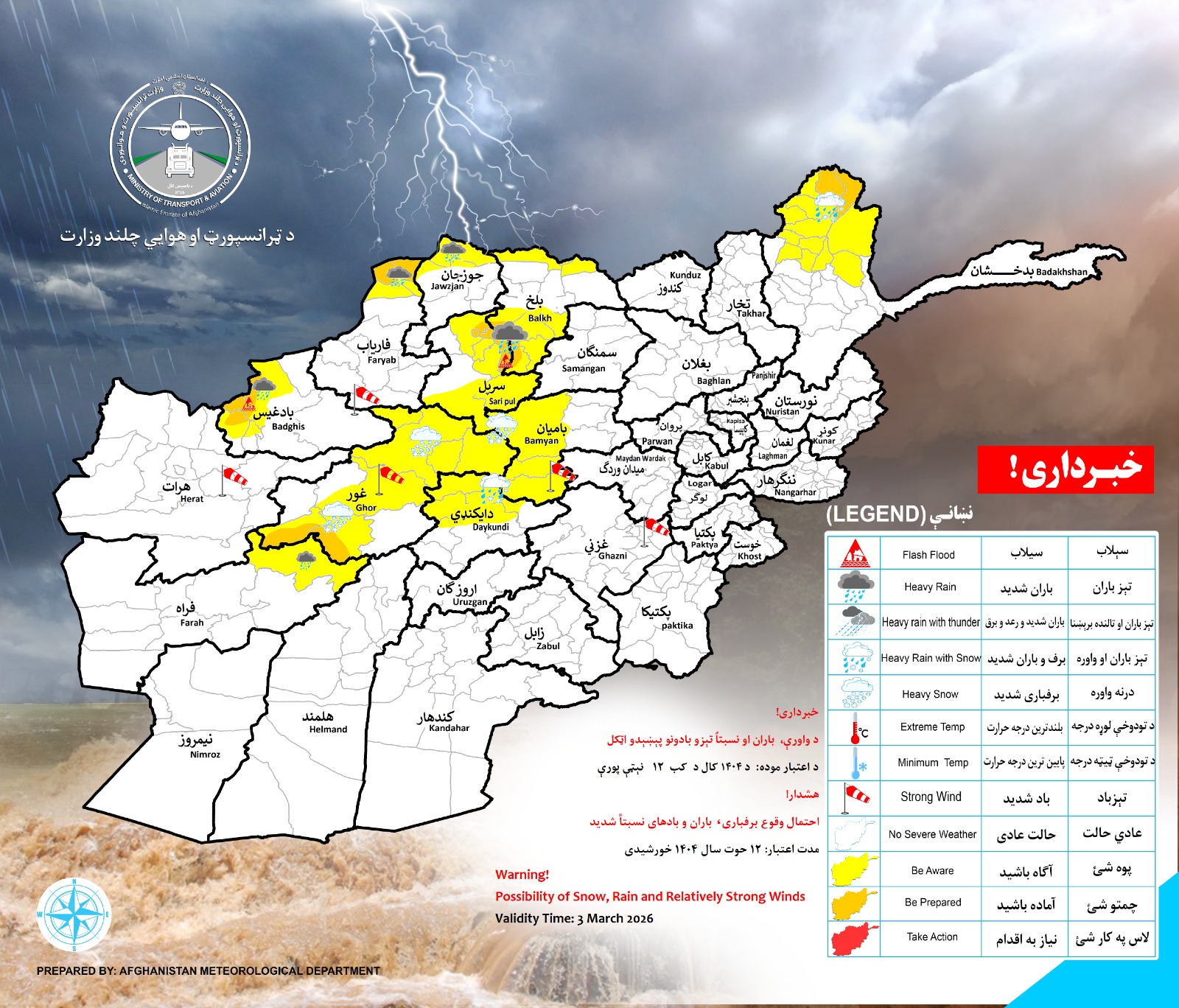 احتمال وقوع برفباری باران شدید رعد و برق و بادهای شدید در ولایات ذیل پیش بینی میگردد