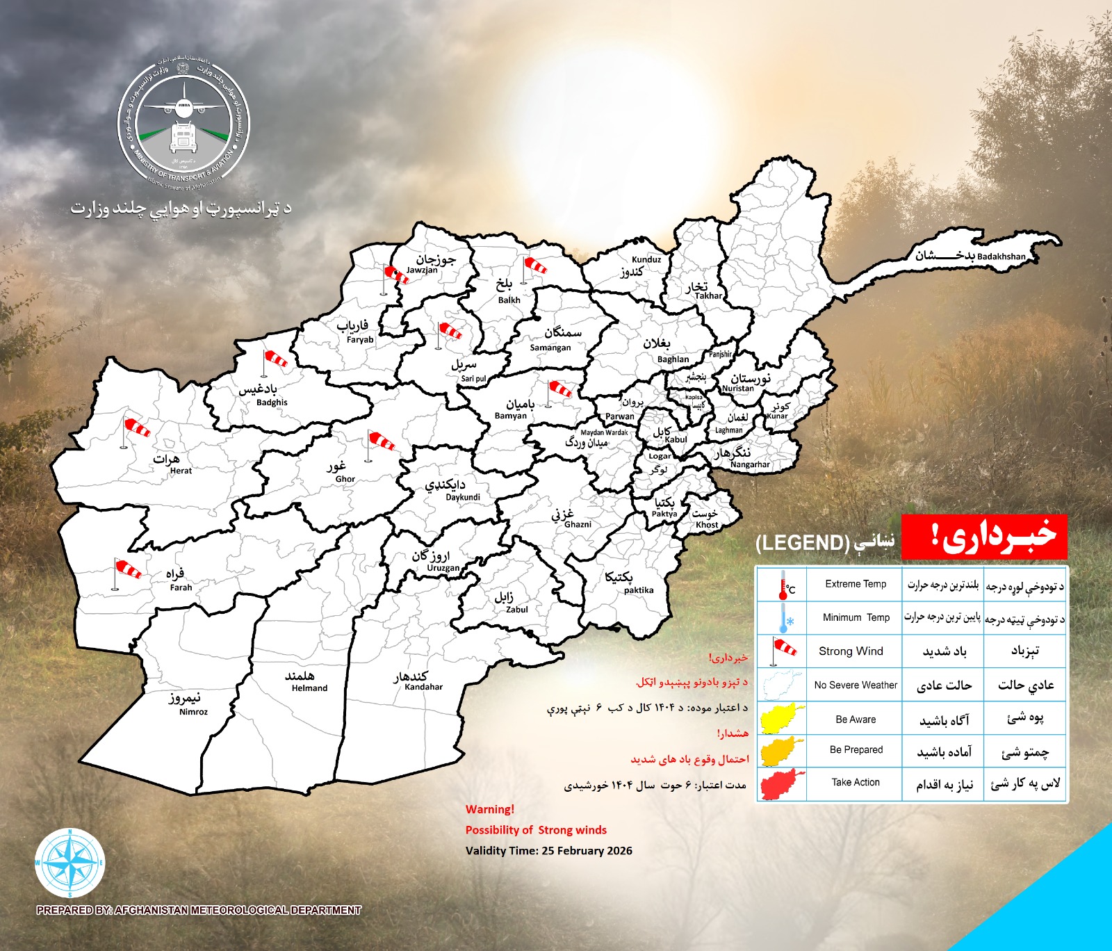 احتمال وقوع بادهای شدید در ولایات ذیل پیش بینی میگردد