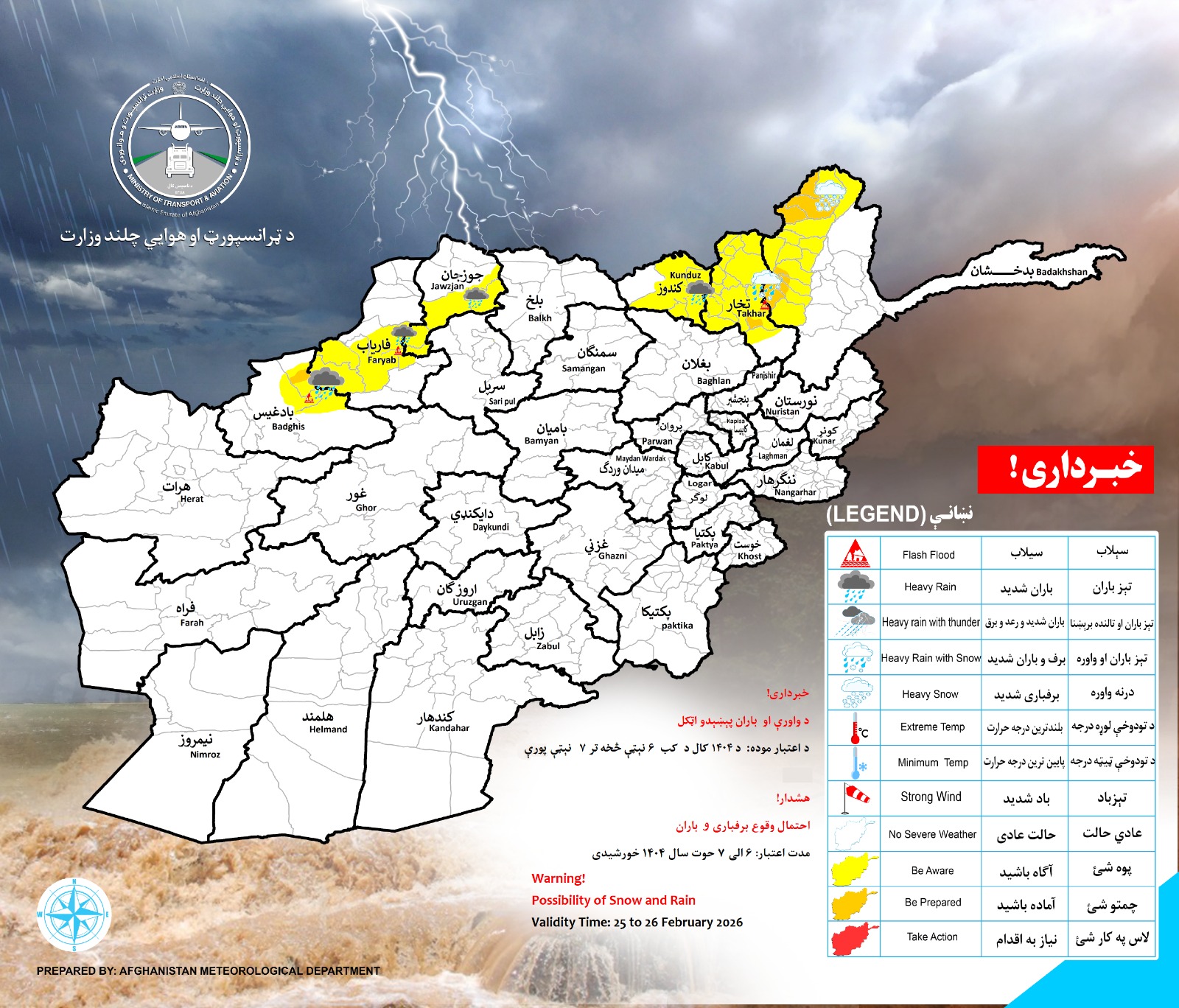 په بادغیس، فاریاب، جوزجان، کندز، تخار او بدخشان ولايتونو کې چې د باران کچه په بېلابېلو سیمو کې له (۱۰) څخه تر (۲۰) ملي متره او د واورې کچه له (۱۰) څخه تر (۲۰) سانتي مترو پورې اټکل کېږي.