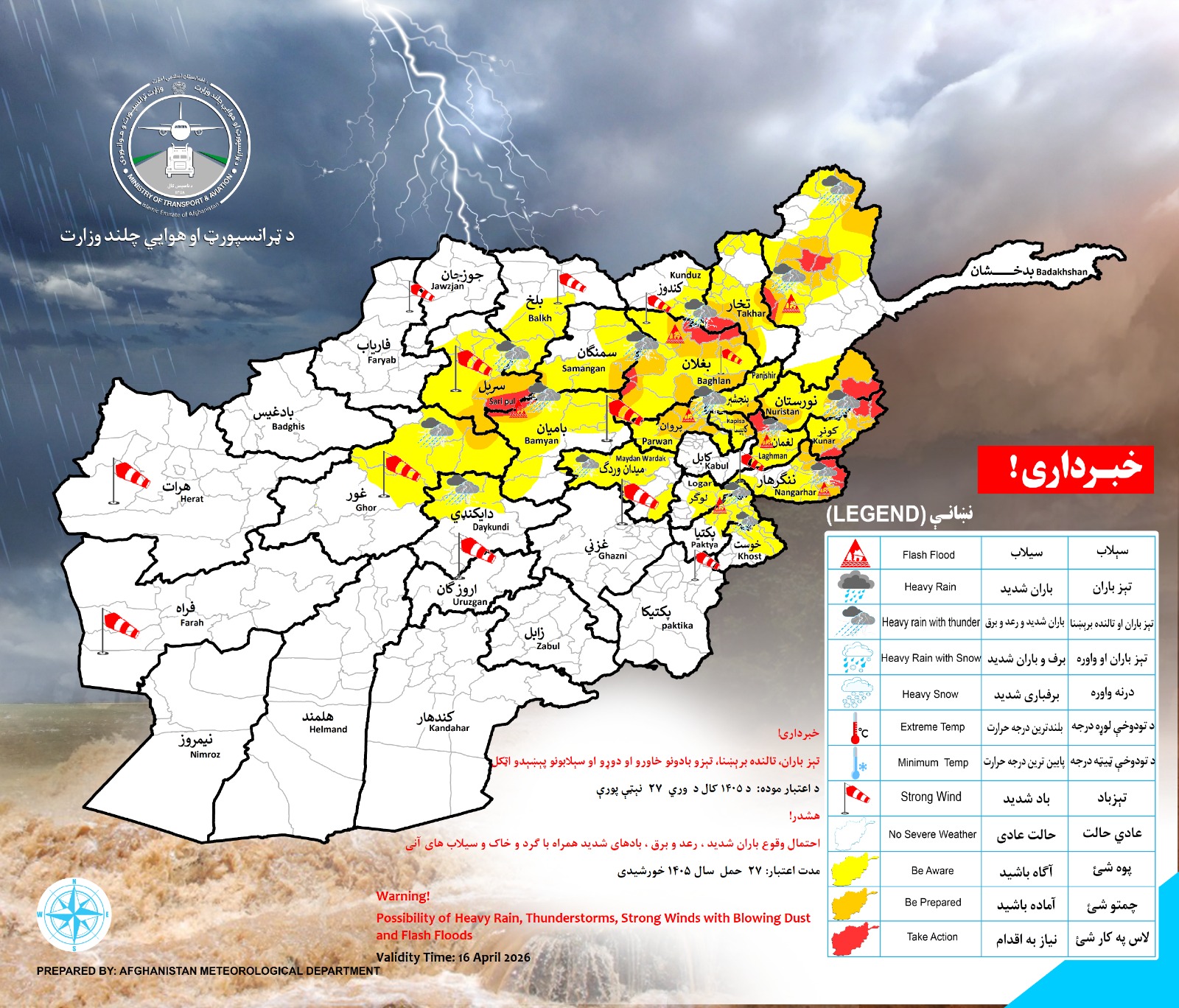 Possibility of Heavy Rain, Thunderstorm, Strong Winds with Blowing Dust and Flash Floods for the following provinces: