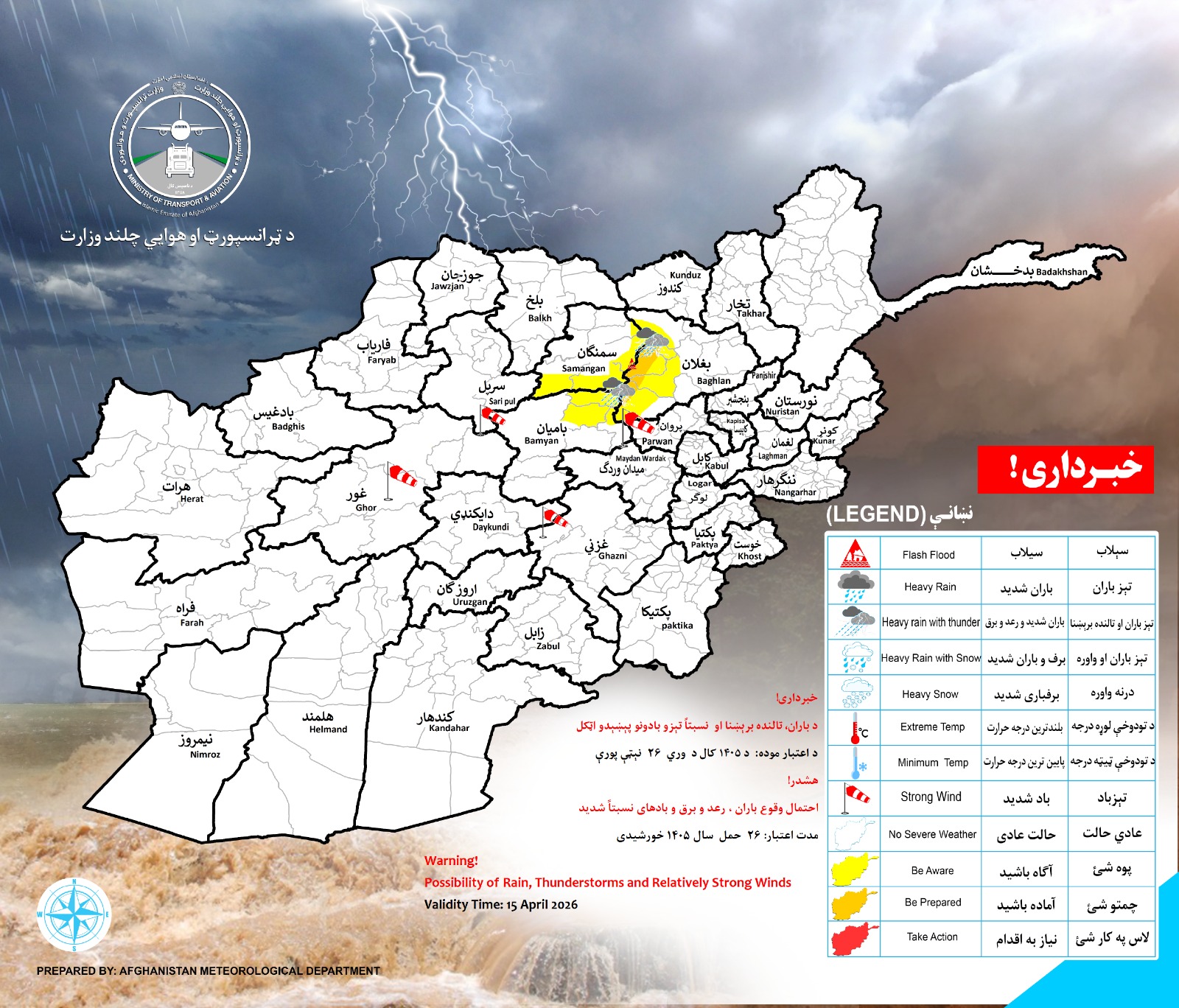 د ټرانسپورټ او هوايي چلند وزارت دهوا پېژندنې ریاست لخوا د هوا حالاتو اټکل.