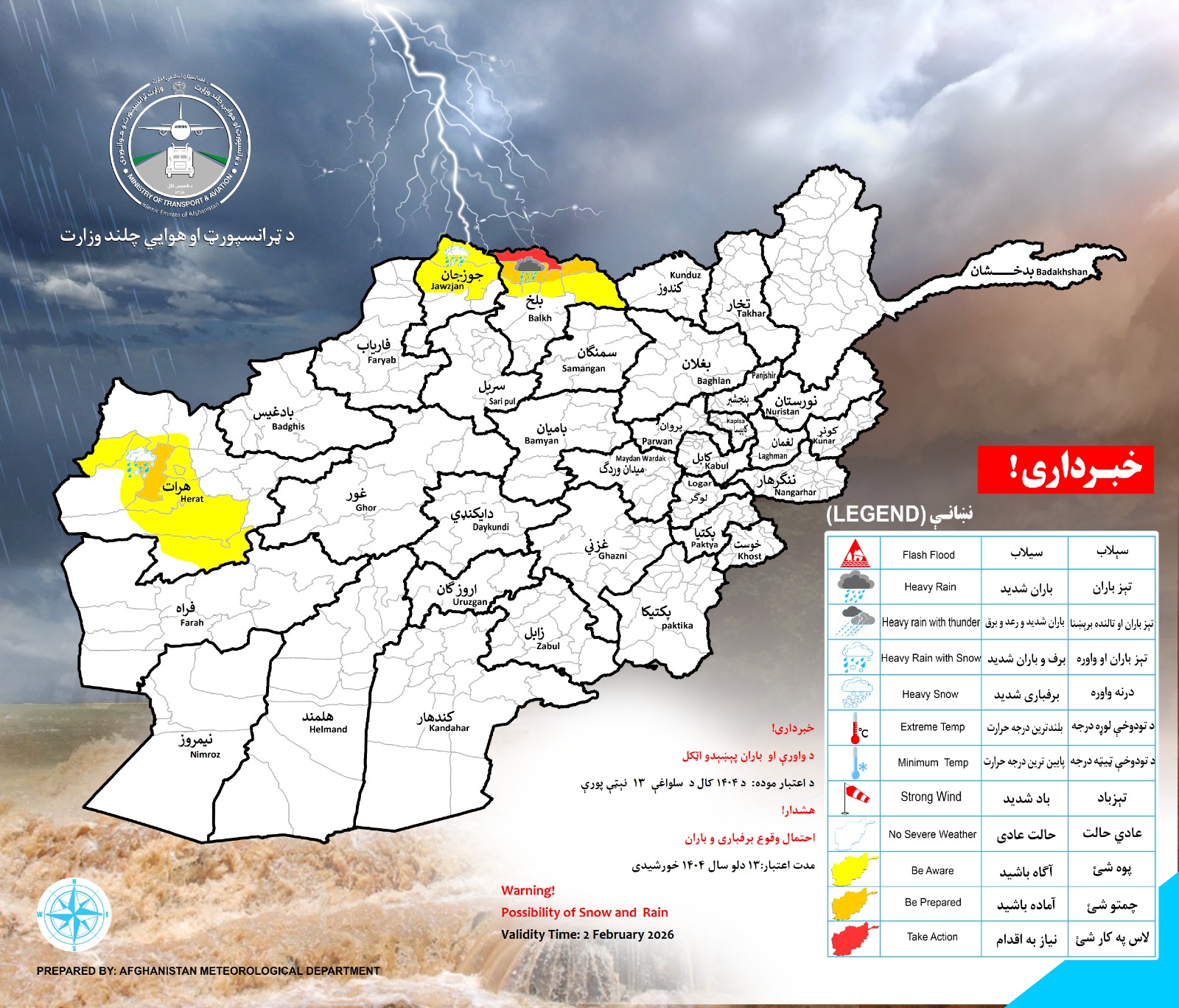 در ولایتهای بلخ جوزجان و هرات که مقدار باران در نقاط مختلف بین (۱۰) الى (۲۵) ملی متر و مقدار برف (۱۰) الی (۲۵) سانتی متر پیش بینی میگردد.